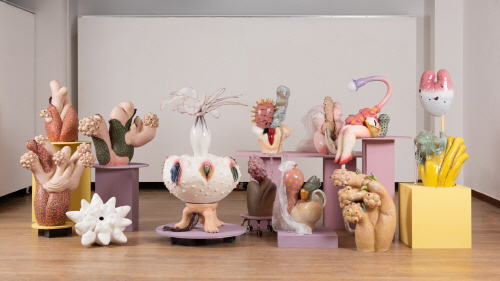 전시장 초입에 들어서면 곰과 항아리의 형태를 결합해 동화적 풍경을 연출한 이채민의 작품을 볼 수 있었다. 항아리를 옷처럼 뒤집어 쓴 곰은 작가 본인의 상징이다. 흙과 유약을 이용해 항아리가 녹아내리는 것 같은 모습을 보여주는데, 이는 물질 전환 자체가 조형요소가 되는 도자매체의 특성과 곰이 좋아하는 꿀의 유동적 형태에서 공통점을 발견해 차용한 것이다. 밝은 색의 나무 전시대와 풀을 함께 설치하여 곰이 휴식을 취하거나 놀고 있는 모습을 보여주며 관객에게 내러티브를 상상하게 하고 편안하고 애정 어린 시선으로 작업을 감상할 수 있게 한다.