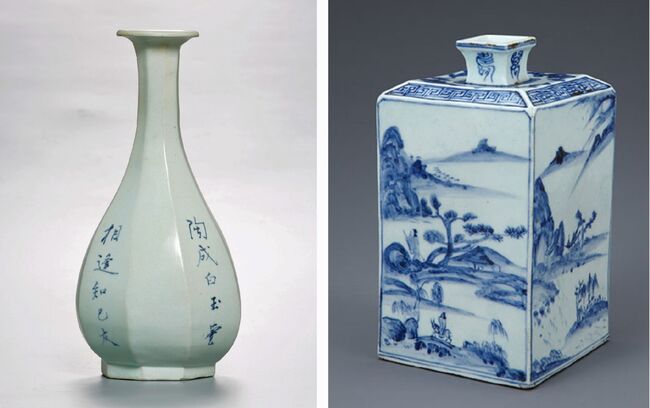 사진1의 「백자 청화 산수누각무늬 사각병」은 제작 과정이 매우 까다로운 판형기법으로 만든 사각 병으로 18세기 후반경에 왕실 관요에서 제작된 유물이다. 이 사각병은 고급의 정선된 하얀 태토를 사용한 사각기둥 모양의 몸통에다 가운데가 좁아지는 유선형의 긴 목에 벌어진 입구를 별도로 성형하여 붙였다. 몸통이 안정적인 형태의 수준 높은 유물로 어깨의 모서리를 비스듬히 깎아내고 고운 발색의 청화안료를 사용하여 무늬를 그려 넣었다. 모깎기를 한 어깨 부분의 경사면에는 간략화된 넝쿨무늬를 그렸고 몸통의 4면에는 각각 테두리 선으로 면을 구성하고 그 속에 원경, 중경, 근경의 산수 인물무늬를 세련된 필치로 능숙하게 그려 넣었다. 마치 4폭의 산수화 병풍이 펼쳐진 모습이며 몸통에 그려진 산수무늬 중에 사진4는 ‘소상팔경도 瀟湘八景圖’ 중에 산시청람 山市晴嵐으로 가까운 근경에 높게 솟은 바위 사이에 이야기하는 두 사람을 배치한 것이다. 산수화의 격이 매우 높아 왕실의 화원화가 작품으로 생각된다. 사진2,3)