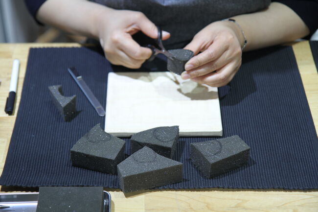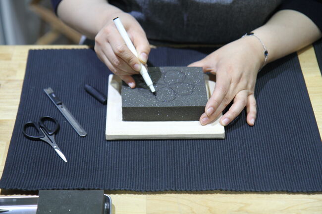 2 스펀지 위에 네임펜으로 스케치할 문양을 그리고 칼로 오려낸다.