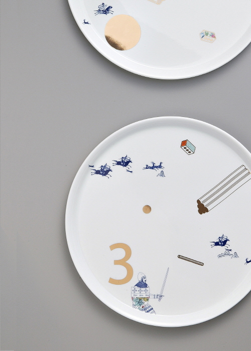 1「East by Northwest」 29.5×29.5×1.5cm, porcelain, 1250°C, Gold Luster & Color decal, 800°C