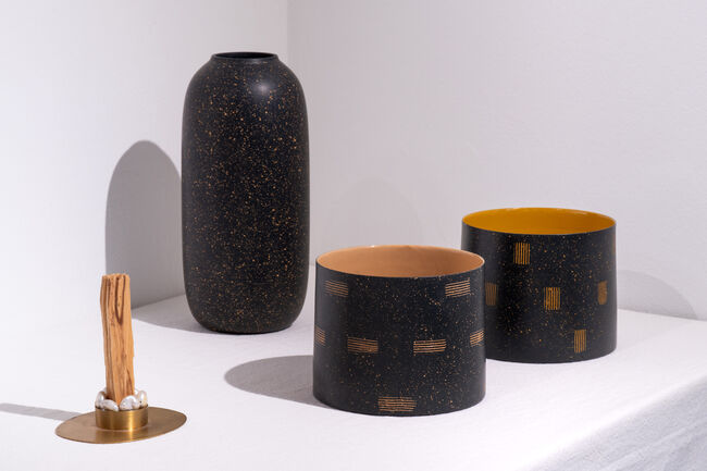 (좌)안은경 「진주 스머징 홀더」황동, 진주 (우)강고운 「이어지는 점」도자(3점)