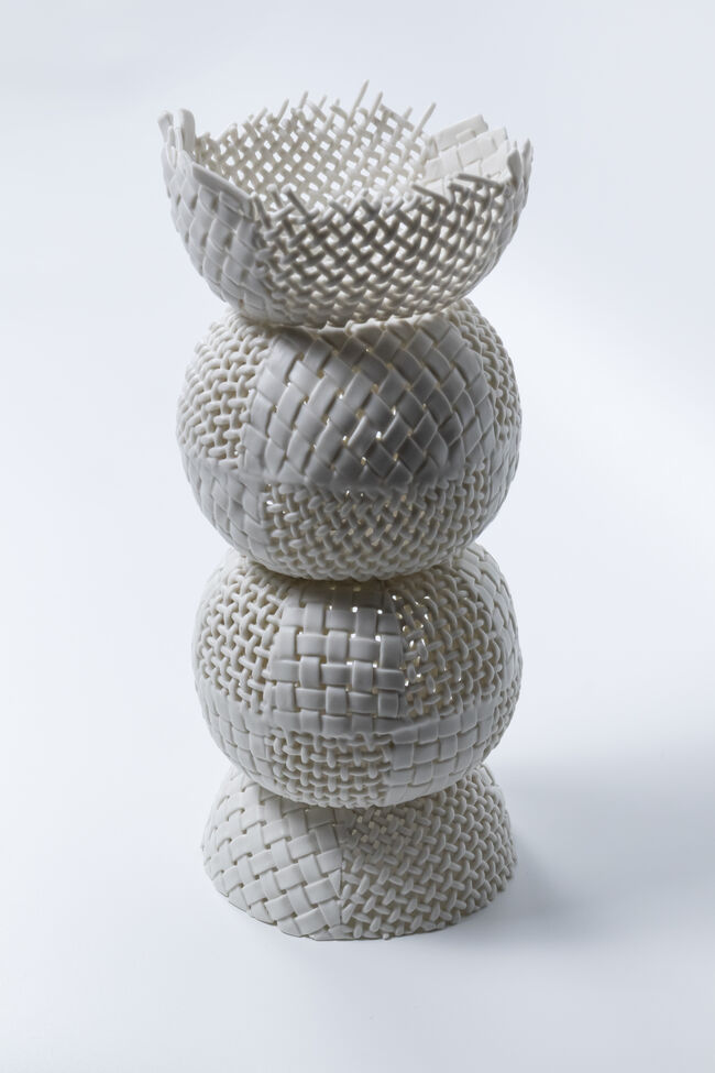 「쌓은 조각보 구체_002 stacked patchwork ball_002」 9x9x22.5cmㅣ도자기(백자)ㅣ2025