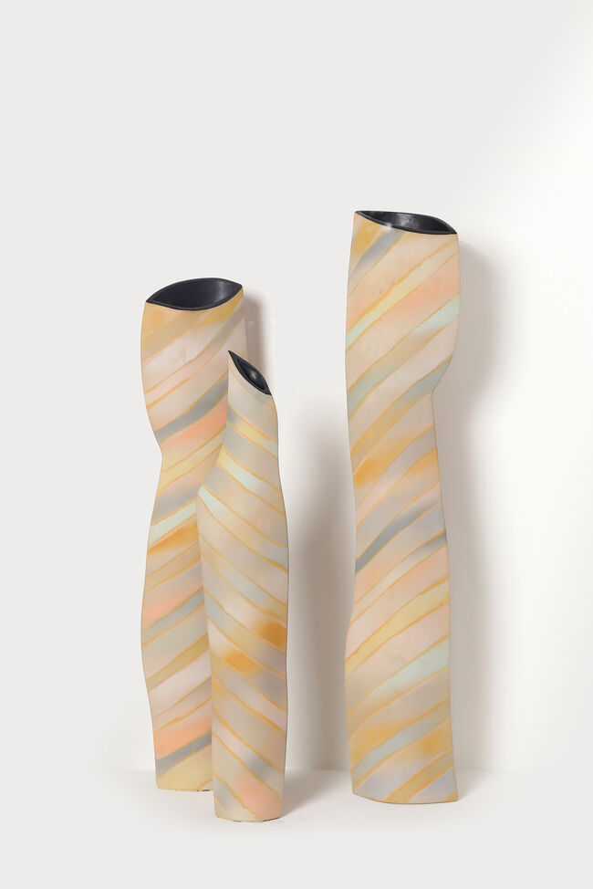 이 작품은 표면장식을 통해 기물의 착시현상을 보여준다. 일반적인 원통형을 물결처럼 변형시키고 표면에 나선형으로 그라데이션 처리한 색상과 선의 결들로 인해 원기둥 형태가 둥근지 납작한지 모호하도록 표현하였다.