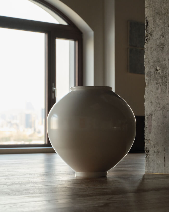 작가는 전통을 마주하면서도 지금 일어날 고요한 반향을 알고 있다. 그의 항아리는 단순히 시각적 형상으로 존재하는 것이 아니라, 음률을 지닌 형체로 감각된다. 불꽃에 의해 생성된 기공, 표면 위의 미세한 음영, 곡선이 주는 촉감적 리듬은 마치 하나의 음악처럼 작용하며, 관람자에게 공감각적이면서도 시적 경험을 유도한다. 가마의 그 타는 뜨거움, 항아리가 탁탁 터지는 소리, 갈라지는 긴장, 손에 느껴지는 흙의 부드러움, 하얀 유약의 겸허함, 그 모든 감각이 달항아리로 태어난다. 존재는 개체가 아니라 맥락이며 종합이며 관계라는 사실이 작가의 행위로 재인식된다.
