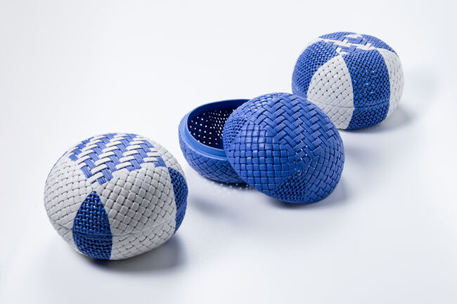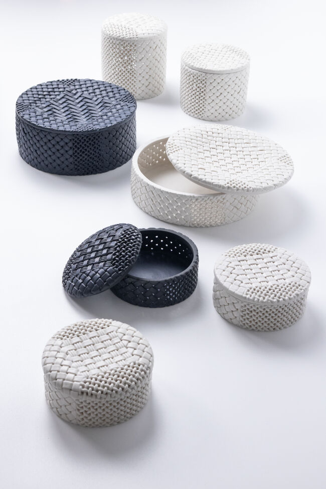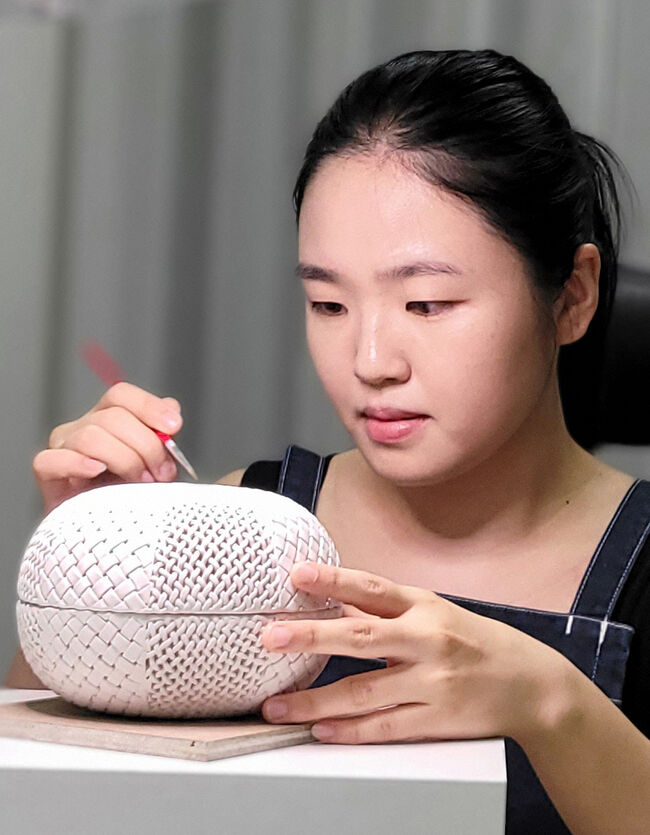 황아람은 초경공예, 짚풀공예 등의 바구니 제작 기법을 도예에 응용하고 소성塑性한 흙의 물성을 활용하여 새로운 가능성을 탐구하고 있다1). 황아람의 주목할 만한 작품들은 흙으로 빚었지만 마치 대나무로 엮은 듯한 크고 작은 합盒이다. 합은 일반 도자기와 달리 뚜껑이 있어 여닫을 수 있고, 아래와 위가 서로 만나 하나가 된다. 합 작품을 제작하는 황아람의 작업과정을 보면, 손 성형 후 석고를 이용한 가압성형 방식을 취한다. 전체적인 형태를 구상하고 모델링을 한 다음, 모형 위에 그리드를 그리고 조각보처럼 면을 적절한 넓이로 나눈다. 모형은 뚜껑과 하단 부분을 각각 석고로 떠서 미리 틀을 만들어 놓는다. 점토를 가늘고 길게 빼서 바구니를 엮을 때와 같은 방식으로 엮는다. 이렇게 엮은 조각들을 모아 석고 틀 안에서 그것들을 이어 붙여 형태를 완성한다. 마지막 과정으로 850℃에서 초벌 소성을 하고 유약을 입힌 후에 1230~1250℃에서 재벌 소성을 하여 작업을 마무리한다. 황아람은 대나무 줄기를 다루듯 흙을 엮어 구울 때, 흙으로 만든 가마보다는 안정적인 온도 유지를 위해 전기가마를 사용한다. 대나무 줄기를 망처럼 엮은 겉모양은 수많은 인연의 실타래를 이어놓은 듯하다. 세상 속에 살아가며 서로 얽히고설킨 인연의 은유적 표현인 것이다.