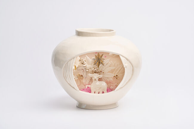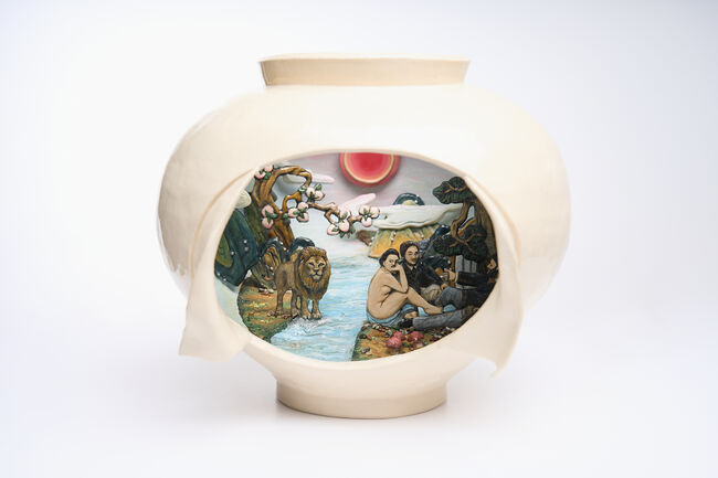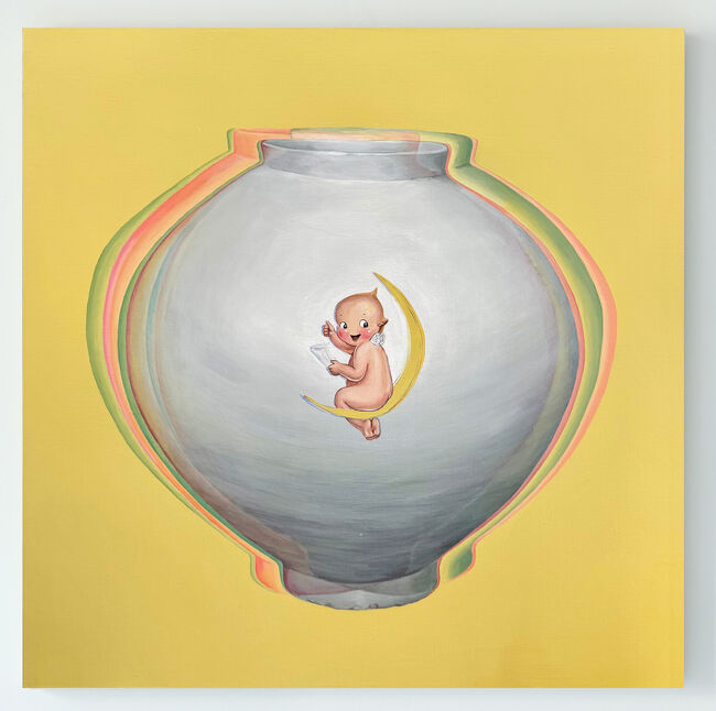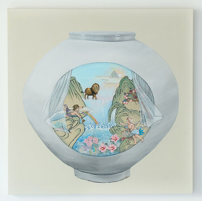 달항아리의 내부에는 15년이라는 공백이 무색할 만큼 긴 시간 숙성된 상상력이 달을 통해 더욱 깊고 넓게 펼쳐지고 있다. 앞서 언급했듯이 달항아리는 단순한 형태가 아니라 작가의 ‘재창조된 기억’을 담아내는 그릇이자, 그녀 만의 독특한 정체성과 세계관을 펼쳐 보이는 무대이다. 따라서 달항아리 안 에 차용된 에두아르 마네의 「풀밭 위의 점심 식사」와 한국의 산수화 같은 이질적인 요소들이 함께 담겨 있는 것은 작가가 문화적 경계를 허물고 새로운 융합을 시도하고 있음을 보여준다고 할 수 있다. 마찬가지 의미로 얀 반 에이크의 「아르놀피니 부부의 초상」과 함께 차용된 민화의 배경과 도령복을 입은 아이 역시 작가 자신의 기억과 경험이 동서양의 문화, 과거와 현재를 넘나들며 어떻게 재구성되는지를 보여 주는 것이다.