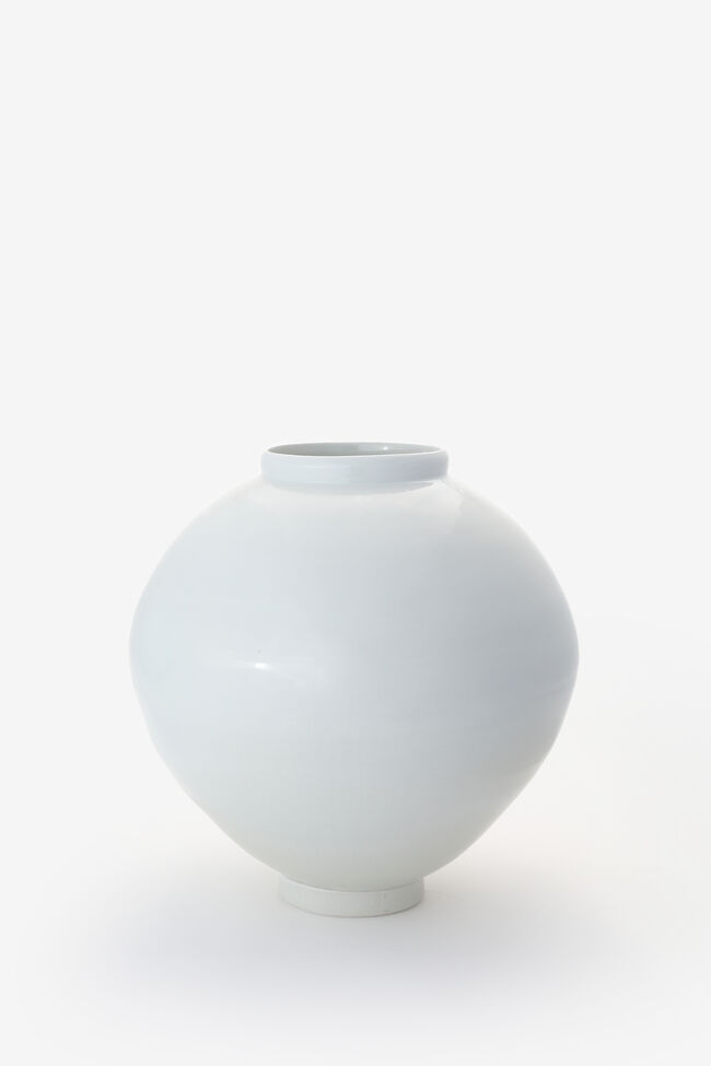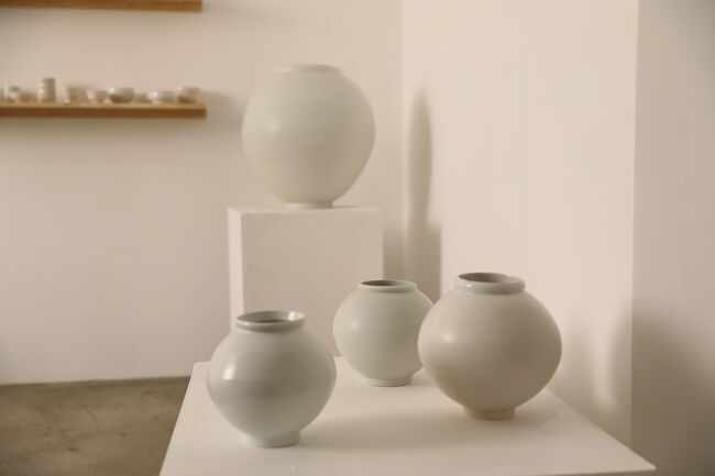 전시장에는 50cm 이상의 달항아리 여섯 점과 중·소형 항아리 30여 점이 놓였다. 모든 항아리는 두 개의 사발을 접합해 완성하는 전통적 방식으로 제작되었으며, 이정우는 이를 현대적 감각으로 해석해 ‘둘이면서 하나’가 되는 존재의 순간을 은유한다. 결과 흔들림은 의도적으로 남겨져 있으며, 그 안에서 발견되는 균형은 관계의 가능성을 상징한다. 양구에서 제작된 백자들은 그 출발점에서 이미 전통과 현재, 과거와 미래를 잇는 사유를 품고 있으며, 200여 점의 잔과 숙우뿐만 아니라 달항아리 역시 저마다 다른 빛깔과 결의 백색을 품고 있어, 관객으로 하여금 단일한 색이 아닌 무수한 감정과 시간을 느끼게 한다.