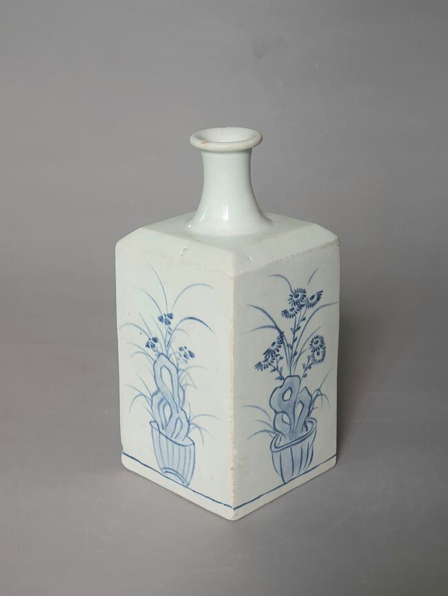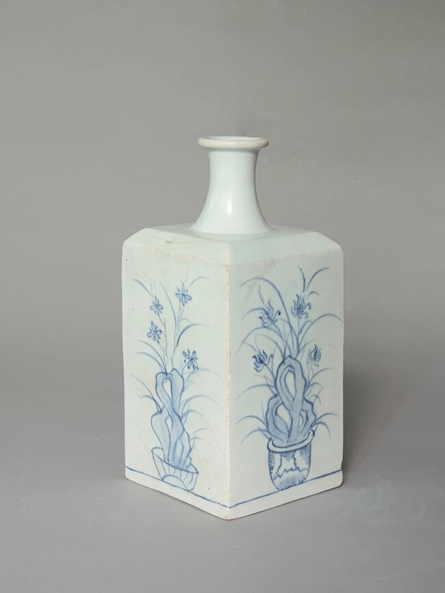 각이 진 4면의 몸통에 비해 목이 길고 좁으며 입구는 살짝 벌어져 있으며 단정하고 안정된 비례의 몸통으로 관요백자 특유의 균형감이 있다. 각 면마다 그려진 무늬는 이 유물의 예술성이 정점에 이르게 하는데 화분과 괴석, 가을 풀꽃이다. 이런 무늬는 청빈한 선비의 고상한 취향을 반영한 것으로 괴석과 난초는 군자의 청아함과 절개, 학문적 고결함을 상징한다. 4면의 무늬는 동일 계열의 괴석과 들풀들로 통일감을 주었으나 각 면의 무늬는 의미의 차이가 존재한다. 제1면에는 난초인데 군자의 네 가지 절개 중 하나로 향기와 절개로 청아한 선비의 상징이며 고결함, 정절, 은은한 덕 등을 의미한다.