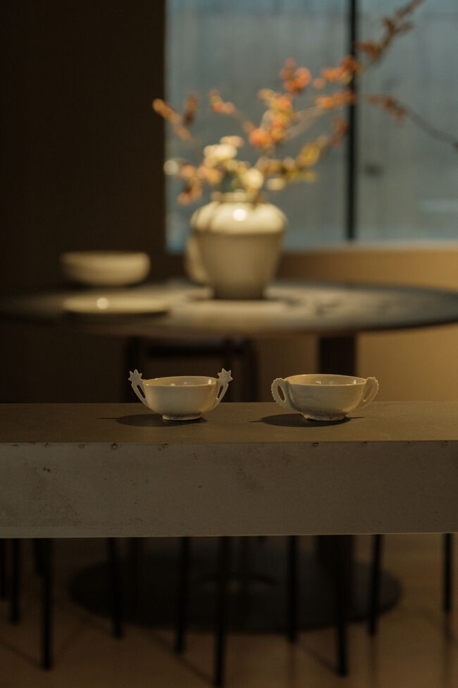 홍두현 작가의 이번 전시는 우리가 서로에게 마음을 전하고 머무르게 하는 방식에 대해 묻는다. 혜존, 마음을 건네고, 마음을 머무르게 한다는 뜻으로 각 작품들은 우리 일상의 보이지 않는 예를 드러낸다. 과거 조선시대 쌍이잔은 술을 나누는 그릇이었고, 전접시는 그 잔을 받쳐 예를 갖추는 기물로 사용 됐다. 오늘의 맥락 속에서 쌍이잔의 두 귀耳는 서로를 향한 연결의 구조로 새롭게 읽힌다. 이런 관계는 하나의 행위라는 구조를 만든다. 각자에게 작은 혜惠를 남기고, 그 마음을 존存하도록 하는 이번 전시를 통해 감각 속 관계, 배려, 존중은 새로운 역할을 획득한다.