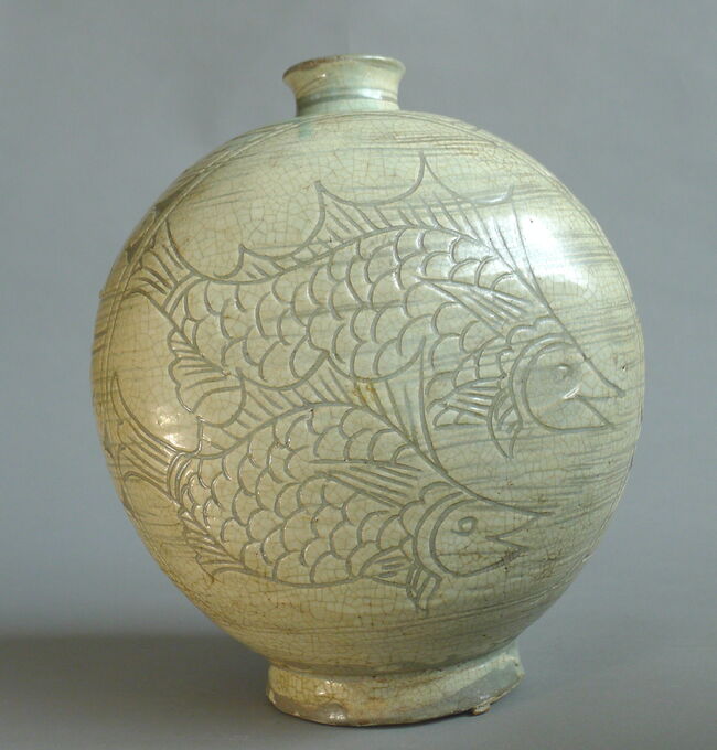 둥근 몸통을 만든 후에 양쪽 면을 두들겨서 납작하게 만든 편병으로 백토분장을 한 후에 자연스럽게 분할된 4면에는 대칭으로 넓은 면에는 물고기 한 쌍과 좁은 면에는 연잎 한 쌍을 조화기법으로 그려 넣었다. 하얀 바탕의 백토분장 붓질 자국은 물고기와 어우러져 자연스럽게 물결무늬처럼 조화를 이룬다, 선각으로 새겨진 물고기는 지느러미와 비늘이 선명하며 역동적이고 거침이 없다. 물고기는 풍요와 다산, 출세의 상징으로 조선시대 길상무늬로 간주되어 도자기뿐만 아니라 목제품이나 금속제품에도 널리 사용되었다. 한 쌍으로 그려진 물고기는 부부의 백년해로를 의미하기도 하며 몸통의 좁은 면에 그려진 연잎은 불교적인 의미로 해석되기도 하는데 진흙 속에서 피어나는 연꽃의 재생과 번영, 다산 성공을 기원하는 뜻을 포함한다. 사진4)