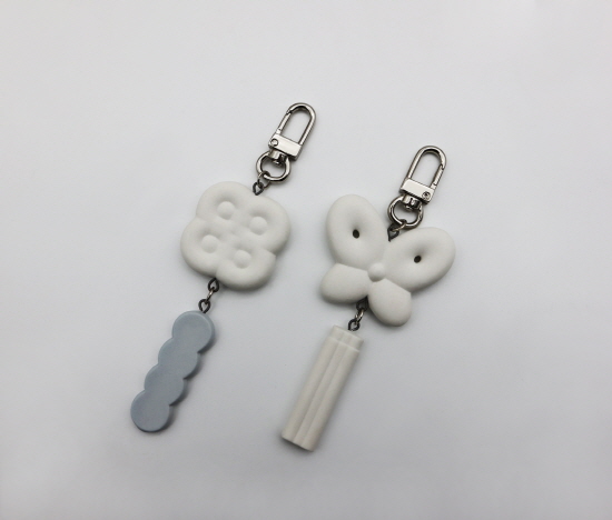 <도자 노리개 키링 DIY세트>는 노리개의 나비매듭, 동심결매듭, 옥으로 만든 패물 등에서 영감을 얻었습니다. 부속을 조립하고 색칠해 나만의 열쇠고리를 만들 수 있는 제품으로, 구성품은 세라믹으로 만든 참charm을 비롯해 금속 링, 고리, 펜치 등 조립에 필요한 각종 도구와 6가지 색의 물감, 붓, 파레트 등이 포함됩니다. 비대면으로 제품을 완성할 수 있게 별도의 번조나 열처리가 필요 없는 재료로 구성하고, 도자 참은 재벌 기물위에 물감이 안착하기 좋게 매트한 유약으로 마무리했습니다.