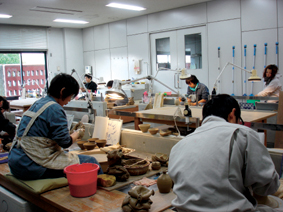 필자의 경우도 자료를 요청한 학교가 여섯곳으로 그 중 세곳을 직접 방문해 보았는데 처음 방문한 중앙학원 도예학교의 경우 도쿄에서 전철을 3번 갈아타고 2시간 걸려 찾아갔다. 이곳은 도자기의 소지 즉 흙에서 아름다움을 찾는 3년제 학교로 1학년 때 백자와 청자를 각각 2번 성형해서 구워본 후 2학년이 되면 일본 전국을 돌며 자기가 생각하는 도자기에 어울리는 흙을 찾아 다니는 독특한 커리큘럼이 있었다. 두번째로 찾아간 교토전통공예전문학교(http://www.task.or.jp/index. html, 홈페이지가 최근 교토 전통공예대학교로 이름이 바뀌었음)의 경우 교토역에서 특급열차로 40분 정도 떨어진 교토부 외곽의 소노베라는 곳에 위치하고 있고 이름 그대로 교토의 전통공예를 전수하는 학교이다. 도자기의 경우 백자소지 위에 그림을 그려내는 교토식 도자기를 가르치고 있으며 체험입학 때 본 모습은 1학년은 물레 연습을, 2학년과 3년차의 연구과 학생들은 도자기에 그림을 그리는 연습을 하고 있었다. 이곳은 실습장에 100여기의 물레가 구비돼있는 일본 최대의 실습장이었다. 마지막으로 찾아가 본 필자가 졸업한 오사카예술대학 부설 오사카 미술 전문학교(http:// www.bisen.ac.jp/index.html)는 오사카 시내 텐노지 역에서 한정거장 떨어진 비쇼엔에 위치해있어 그간 방문해온 학교 중 유일하게 도심지에 있었다. 오사카 미술 전문학교의 경우는 도자기를 만드는 것이 최종 목표이지만 관련된 다른 부분을 같이 익힘으로써 전통적인 그릇이라는 도자기의 관념을 벗어나 자기를 표현하는 것을 중시하는 학교였다.