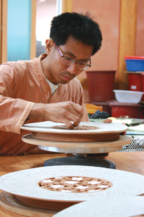 이곳에 집을 짓고 들어온 것은 지난해 7월. 듣지 못하는 어려움이 있는 작가는 진천공예마을 입주대상자로 선정되는데 있어 세계장애인기능올림픽대회 수상경력이 많은 도움이 되었다. <2002년 전국장애인기능대회> 도예기능부문 1등으로 선발되어 한국대표로 2003년 인도 뉴델리에서 열리는 세계장애인기능대회에 참가해 금메달을 땄고 2004년 동탑산업훈장을 수여받았다. 1994년 홍익대학교에서 도예를 전공하고 대학원을 졸업하기까지 이인진, 신상호, 최성재 교수님의 작업장에서 작업을 도우며 많은 것들을 경험하고 배웠다.