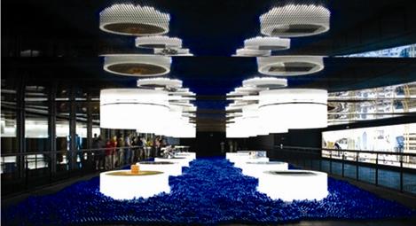 1층과 2층을 잇는 계단에는 웅장한 파빌리온 형태의 조형물에 도자작품들이 장식되는데, 외부의 대형조형물이 철구조물 위에 거친 느낌의 시멘트로 이루어진 것과는 대조적으로 이 작품은 격자구조의 목조형물로 이뤄져 딱딱한 느낌의 계단 공간을 보다 부드럽고 따뜻하게 감싸 안는다.