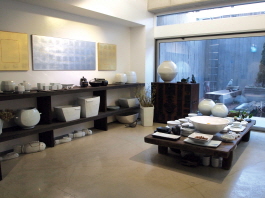 1층 입구로 들어가면 먼저 그릇, 대접, 합, 컵, 항아리 등 온갖 종류의 도자기들이 눈에 들어온다. 낮은 테이블에 쌓인 그릇들, 가구 위에 배치된 달항아리 등은 대부분 우일요 작품들이 많고 이곳저곳에 젊은 작가들의 작품도 눈에 띈다. 조금 더 안쪽으로 걸어들어가자 멋스런 원탁 테이블과 넓직한 직사각 테이블에 찻잔과 주전자, 그릇이 셋팅돼있다. 곳곳마다 자연스럽게 배치된 앤틱, 모던 가구들과 도자기 그리고 다양한 소품들은 널찍한 공간 안에 답답하지 않게 놓여있다. 곳곳의 크고 작은 도자기 소품들은 운영자 한경화(53)대표가 그동안 모아 온 소장품. 도자기를 워낙 좋아하는 탓에 국내외에서 예쁜 도자기만 보면 구입해 왔다고 한다.
