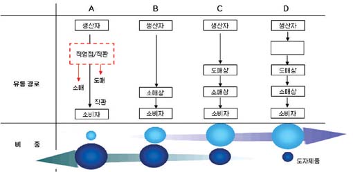 국내 요장업체의 유통경로를 일반 소비재 제품들의 유통경로와 비교해 보면, 대부분의 요장업체의 유통경로는 ‘A’타입 형태를 띠고 있다. 일반적으로 C, D타입으로 갈수록 소비시장에서 인기가 높고, 판매가 왕성하며 브랜드가치가 높은 제품군에서 나타나는 유형이다. 즉 메이저 유통업자들의 참여와 관심이 높은 경로라고 볼 수 있다. 앞서 <그림 1>에서 살펴본 백화점, 할인점 등에서 판매하는 대부분의 제품군들은 C, D타입과 같은 유통경로를 따르고 있다. 현재와 같이 요장업체가 직접 도매상이나 소매상과 거래하지 않고, 요장 직영점/직판에 의존하여 영세한 규모의 도소매 행위만 간헐적으로 이루어지고 있다는 것은 그 만큼 유통업자들의 관심 밖의 품목으로 밀려나고 있음을 단적으로 보여주고 있다는 것이다.