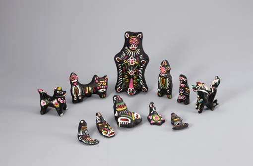 인형은, 만물을 사랑하는 마음과 삶의 지혜를 얻을 수 있도록 아이들의 성별과 성장에 맞추어 다양한 소재로 만들어진다.(도8) 본래는 사람의 형태를 가진 기원의 대상이나 주술과 깊은 관련을 맺으면서 생겨난 것이다. 또는 왕후귀족 등 권력자의 죽음에 임하여, 순장 대신에 매장한 도용陶俑 종류도 있다. 진시황제의 능묘에 묻혀진 방대한 양의 도용이야말로 그 상징적인 예이다. 이 두 인형은 모두 신강 위구르족의 전통적인 진흙 인형으로, 의복과 모자, 그리고 머리 모양이나 화장법 등이 한민족의 그것과는 명백하게 다르다.(도9) 가무의 상에 보이는 춤을 추는 모습이나 악기를 연주하는 방식에도 특색이 나타난다. 보고 있노라면 마치 지금이라도 움직일 것만 같이 귀엽다.