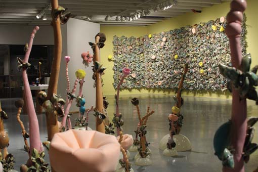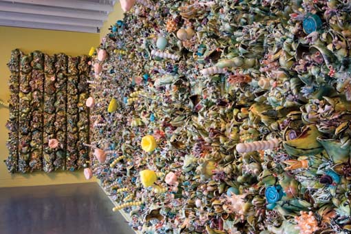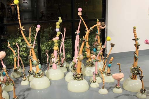 전시장 벽면에는 온통 고부조 형태의 이름 모를 식물과 꽃들로 가득히 채워져 있었다. 스립 캐스팅slip casting, 석고틀을 만든 후에 흙물을 넣어서 원하는 형태를 뽑아내는 기술을 이용해서 만든 자기porcelain 형태의 식물과 꽃들은 다양한 천연색의 칼라로 뒤덮혀 있었다. 마치 해저 속에서 자연증식을 거듭하는 익명의 산호와 엽상체, 해면동물, 그리고 만각류蔓脚類, Cirripedia들이 갤러리를 온통 에워싸고 있는 형국이었다. 작품에 가까이 다가가서 보니 거북손, 조무래기따개비, 주머니벌레, 줄따개비등 백과사전에서나 볼 수 있을 법한 다