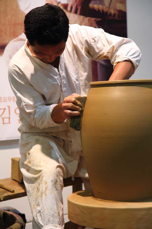 1층 전시장에 들어서자 명장들의 작업 소리가 관람객들의 청각을 자극했다. 이재순 석장과 제자들은 망치와 정을 이용해 대리석 석조물을 깎아냈고, 김극천 박문열 두 석장은 구리와 주석이 합금된 황동(놋쇠)을 망치로 두들겨 장신구를 제작, 박명배 소목장은 목가구를 만들기 위해 나무 자르기와 대패질을, 방연옥 명장은 베틀을 이용해 한산모시짜기 시범을 선보였다. 이 중 박명배 소목장은 “1층은 스케일이 큰 작업이 많고 소리가 울리기 때문에 관람객들에게 인기가 많은 것 같다”며 “이러한 기회를 통해 전통 공예에 대한 일반인들의 관심이 높아졌으면 한다”고 전했다. 2층 전시실에는 송방웅 나전장을 비롯해 조대용 염장, 김희진 정봉섭 매듭장, 김덕환 금박장, 구혜장 침선장, 이형만 나전장 등이 참여해 숙력된 손동작을 이용한 세심한 작업 장면들을 선보였다. 3층 전시장에 들어서자 여주에서 오부자옹기를 운영하는 김일만 옹기장과 제자이자 아들인 4명의 옹기장이 돌아가며 발물레 위에서 옹기를 빚고 있었다. 그중 셋째 아들인 김창호는 “이런 특별한 전시나 행사를 통해 오부자옹기를 알게 돼 찾아오는 분들이 많다”며 “우리로서는 전통 옹기를 많은 분들께 알리고 선보일 수 있어 좋은 기회다”라고 말했다. 이 밖에도 장순자 박창영 갓일장이 머리카락만큼 가는 세죽사를 한 올 한 올 엮어갔고, 장용훈 홍춘수 한지장은 희고 윤이 나는 닥종이를 만들기 위해 열심히 물질을 이어갔다.