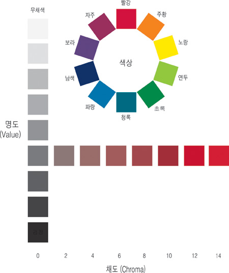 색상hue은 가시광선의 파장으로 분류하는 것으로 유채색의 계열을 구분하는 속성이다. 명도value 또는 밝기lightness는 밝고 어두운 정도를 나타내는 것으로 유채색에는 색상과 명도가 모두 있지만 무채색에는 명도만 있다. 채도chroma, saturation는 색상의 선명도를 말하는 것으로 유채색 강도를 느끼게 하는 정도를 나타내는 것이다. 또한 순색의 정도를 의미하여 순도라고도 한다. 우리는 어떤 색을 지각할 때 항상 이 세 가지 요인을 함께 느낀다.