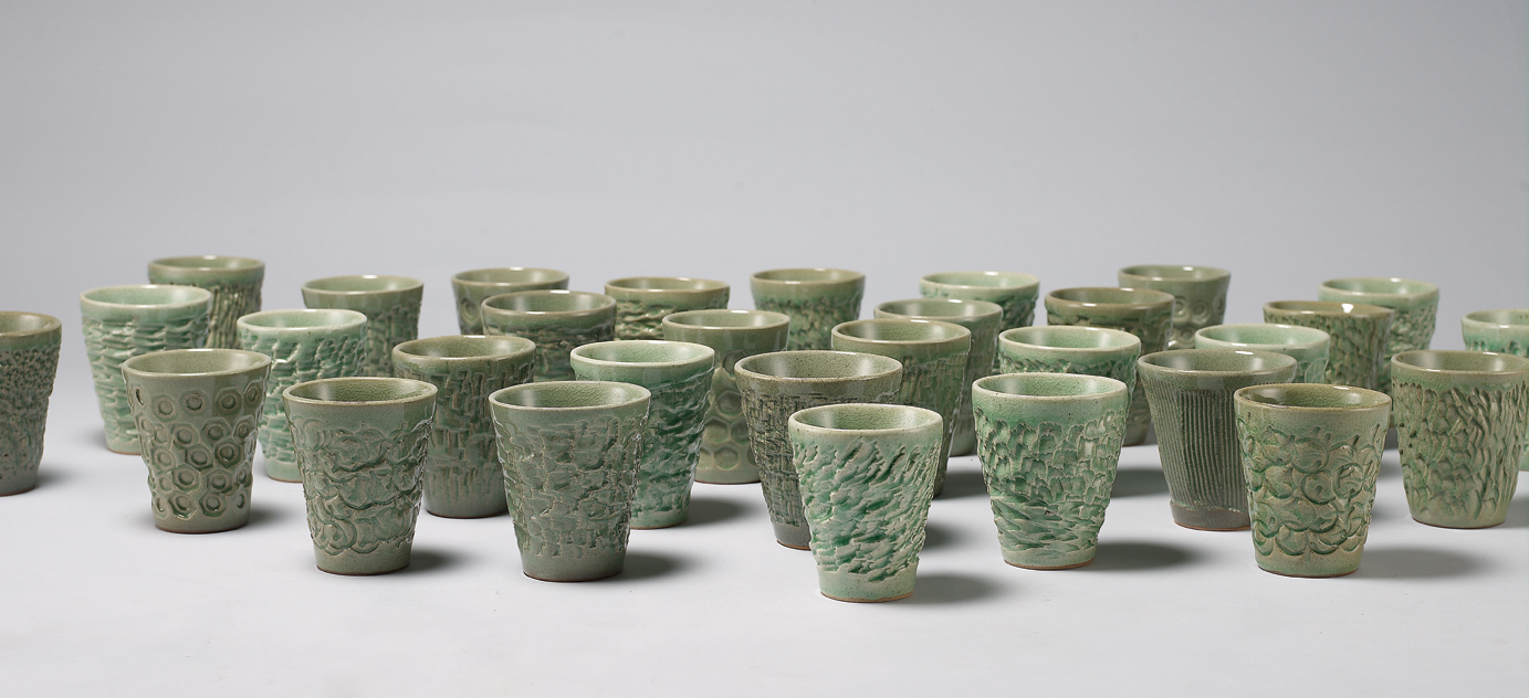 작은 백토의 오브제 작품은 사각형이나 원형을 기반으로 형상을 만드는데 그 조형방법이 독특하다. 그 형태는 하나의 형식으로 만들지 않고 점토조각을 각기 다르게 길게 만들어서 붙여가며 형상을 만들고 있다. 마치 여러 가지 직물천을 덧대 붙여 한 점의 의상을 만들듯 여러 조각의 얇은 점토판들이 덧대어져 사각형이나 원뿔형의 형태로 만들어 지고 있는 방식이다. 이것은 위대한 문화의 완성은 하찮고 작은 여러 가지 것들이 모여서 이루어질수 있다는 의미이고 그러므로 미세한 것들에 대한 정당한 존재성을 부여해야 한다는 작가의 발언일 것이다. 일상에 흔히 볼 수 있고 매일 사용하지만 우리가 잠시 그 효용성을 모르고 있는 일인용 청자 컵의 제작도 같은 맥락의 작품이다. 특별히 소중할 것도 없는 물컵들에게 작가는 매우 진지하고 치밀하게 표면을 조각하고 다양한 문양을 새겨 넣고 있다. 그 정교함은 일상용으로 쓰기보다는 장식장에 넣어야 할 것처럼 고난도의 기교를 보여준다. 일상의 중요성을 환기시키듯 평범한 청자컵의 표면에서 그날의 중요한 흔적들을 보는것 같다. 문양은 조각도구로 강렬하거나 부드럽거나 빠르거나 느리거나 등의 강약으로 붓을 휘두르듯 선의 흔적에 중점을 두고 다양하게 새겨 넣었다. 이것은 오늘은 언제나 같은 일상이 아니라는 의미일 것이며 또한 삶이 어떻게 기록되는가는 표면에 그어 내리는 선들의 향방처럼 잠깐의 차이에서 생겨난다는 메시지일 것이다.