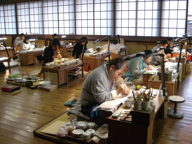 마지막으로 아리타의 생산시스템을 보면 매우 독특한 구조를 갖고 있는데 이를 한마디로 말하면 분업생산시스템이라고 할 수 있으며 매우 복잡한 구조로 되어있다. 먼저 제작 면에 있어서는 크게 도자기의 기형제작과 채색작업으로 나눌 수 있는데 기형제작은 대부분 내산지역의 산중에서 초벌과 재벌을 가마별로 분업화해서 담당하였고 여기서 생산된 기물은 아리타 내산의 평야지역에 위치한 아카에마치赤繪町로 보내져 상인들에 의해 채색이 되어 시장으로 반출되게 된다. 언뜻 보면 단순한 구조이기는 하나 이를 위한 제도적 장치는 매우 복잡하였다고 하며 큰 화재로 인한 자료소실로 추론에 그치고 있는 점은 매우 안타까운 일이다. 여기서 주목할 점은 장식의 중요성을 당시의 상인들은 간파하고 있었다는 점이다. 상인들은 최종적으로 재벌소성이 된 순백의 기물을 구입해 계절별, 의식, 제례, 생활 등에 맞는 문양을 융통성 있게 선정해 판매효율을 극대화 시켰던 것이다. 한편 수직계열의 분업을 살펴보면 먼저 조선시대의 관요에 해당하는 나베시마가마가 있었고 바로 밑에는 씨족의 종가에 해당하는 카키에몽가마, 이마에몽今右衛門가마 등이 있으며 이 밑에는 이들의 친족들이 운영하는 소수의 가마들이 복잡한 분업의 형태로 생산을 유지하고 있었다. 이러한 분업시스템은 대량의 주문에 유연하게 움직일 수 있었으며 겐로쿠元祿1688-1707의 버블시기에도 위기를 넘기는 주요한 역할을 하게 된다. 이상 살펴본 바와 같이 아리타는 시장을 제대로 예측하고 능동적인 자세를 취한 강력한 리더쉽과 바른 정책 그리고 타 문화에 대한 수용 자세를 바탕으로 17세기 세계최대의 도자기 산지로 자리매김 하였던 것이다. 물론 타 문화 수용에 있어 그들의 올바르지 못한 행동이 있었음에도 불구하고 그들은 이 후 현명한 대처를 통하여 아리타도자기의 세계화에 성공하였던 것이다.