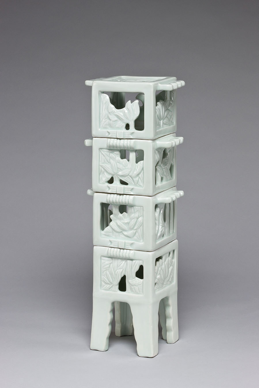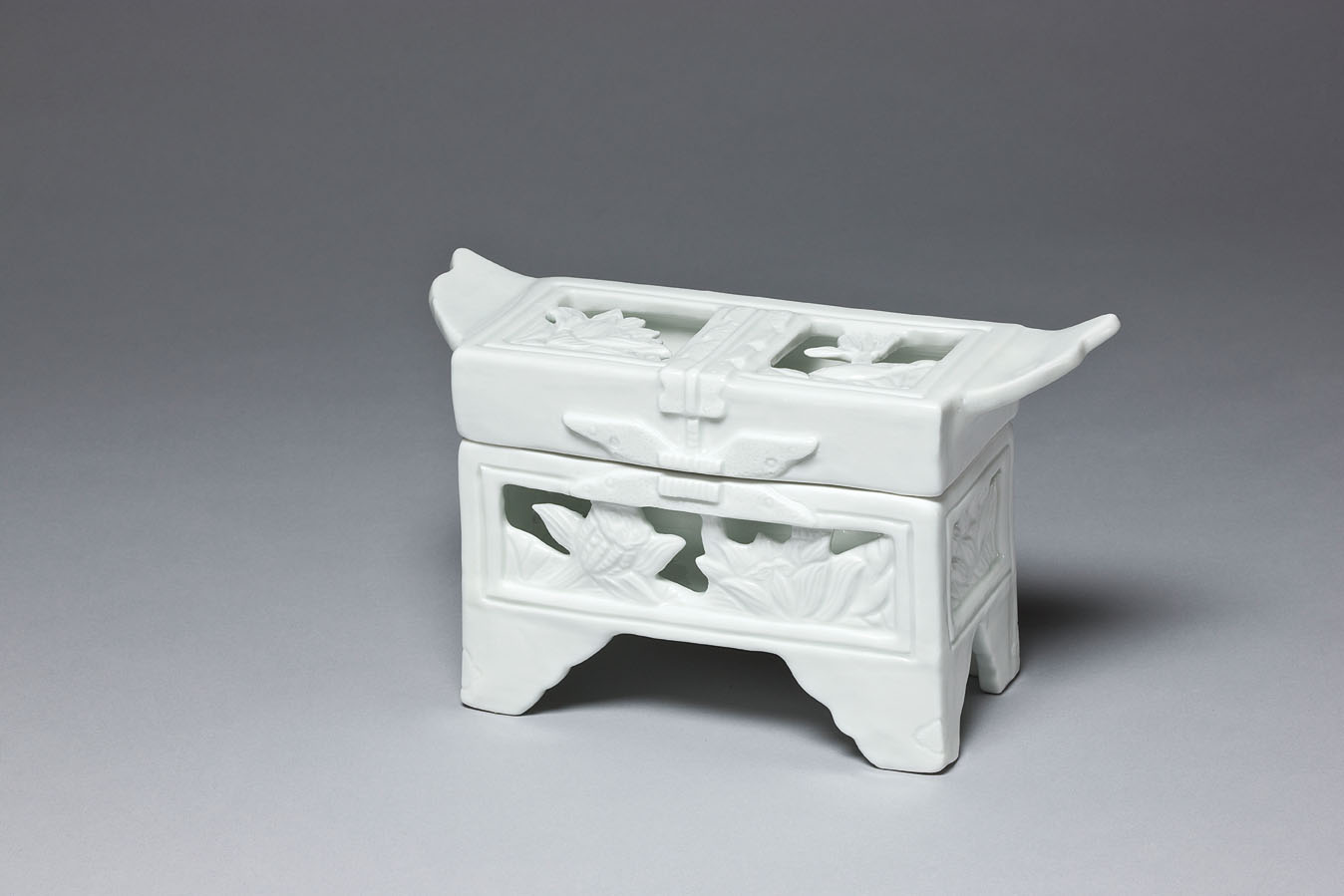 예민한 백토를 가지고 양각과 음각 그리고 투각기법을 사용하여 백자함을 만드는 것입니다. 이 백자함은 우리 전통 목가구의 형태와 금속장식품들의 특징이 표현되게 만들고, 조각도로 길상적 의미를 지닌 전통문양을 새겨 넣습니다.