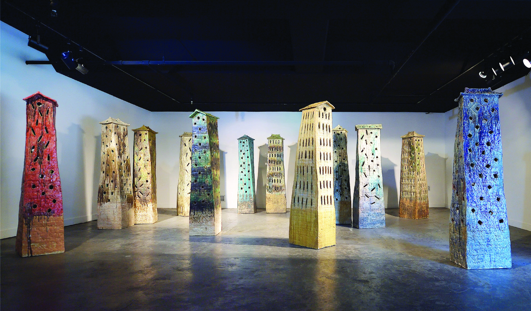 <집>연작은 1980년대 이후부터 물레작업과 병행해왔던 오랜 손작업에 근간한다. 반복과 중첩의 새로운 확장을 위해 물레성형 대신 손을 동력 삼고 화면성, 공간성이 한층 강조된 <집> 연작을 더욱 확대하고 있다. 이인진의 집은 물레성형 특유의 속도감, 기계성, 반복성과 대칭성을 내려놓는 데서 출발한다. 다리 사이에 물레를 끼고 기계의 회전 방향과 속도에 나의 신체의 리듬을 맞춰야 하는 물레성형과 작업 테이블 위에서 손끝뿐 아니라 온몸에 힘과 운동성을 부여하며 일일이 흙을 만지고 누르고 다지는 손성형은 전혀 다르다. 이 과정에서 물레작업과는 다른 작가의 신체성과 운동성이 강하게 부여된 형태 그리고 비연속성이 두드러지는 자연스러운 형태가 도출된다. 시간이 흐를수록 기물이 대칭성과 원형성을 탈피하여 점차 형태와 규모가 다양해지고 평면성과 화면성이 강한 사각 구조물이 확대되는 것도 이와 무관하지 않다. 손작업은 작업자의 지문, 손마디의 너비,누름의 강약 차이, 속도와 쉼의 간격을 흙 속에 고스란히 축적시킨다.