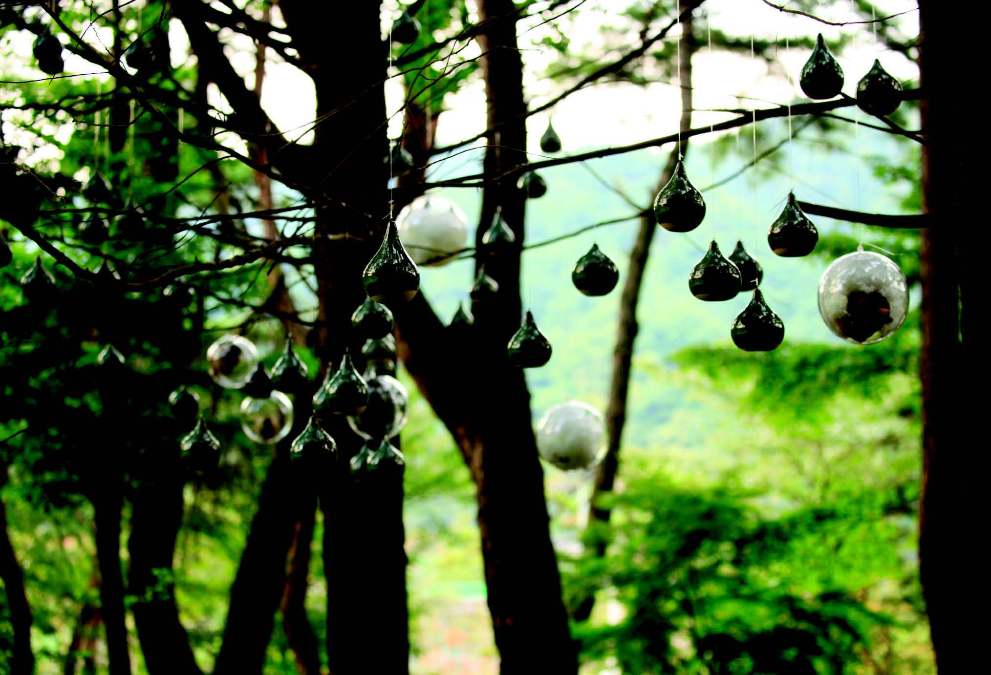 푸른 소나무, 대나무, 편백나무와 느티나무 등 다양한 수종이 어우러진 당산 숲에서 박현수 도예가의 일곱 번째 개인전 <숲속의 정령>이 펼쳐졌다. 자연·빛·생명을 주제로 준비한 이번 전시는 실내 갤러리가 아닌 야외설치작품전이라는 점이 특징적이다. 이 독특한 전시장에 대해 박현수 도예가는 “6회 개인전은 자연을 품은 그릇전으로 그릇에 자연을 담으려 했다면, 이번 전시는 자연의 품속에 나의 작품을 안겼다”고 말했다.