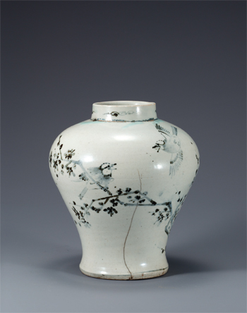 이후 결국 표현하고자 했던 주문양만을 여백을 두고 공들여 회화적으로 표현하고 보조문양은 점점 간략화 되거나 사라지는 것이다. 국립중앙박물관 소장 「매화 대나무 새무늬 항아리」는 보조문양이 사라지고 주문양만이 화면 전체를 차지한 모습이다. 여백과 회화적 표현이 돋보이는 조선 전기 청화백자의 전형이라 할 수 있다. 매화나무 가지를 윤곽선을 사용하지 않고 바로 그리는 몰골법沒骨法으로 그렸고, 나뭇가지에 앉은 새와 날아드는 새가 반갑게 만나는 모습을 정답게 표현하였다. 새의 눈과 부리, 통통한 몸통과 깃털, 꽁지 표현 등이 사군자四君子의 하나인 매화와 어울려, 종이나 비단 위에 그린 회화와는 또 다른 생