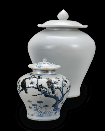 왼쪽 「매화 대나무 새무늬 항아리白磁 靑畫 梅鳥竹文 壺」 높이 16.5cm, 조선 15∼16세기, 국립중앙박물관 소장, 국보 제170호오른쪽 「항아리白磁 壺」 높이 25.0cm, 조선 15∼16세기, 국립중앙박물관 소장