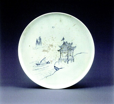 「백자청화산수문접시」 높이 3.3cm(구경 29.0cm), 18세기, 국립중앙박물관