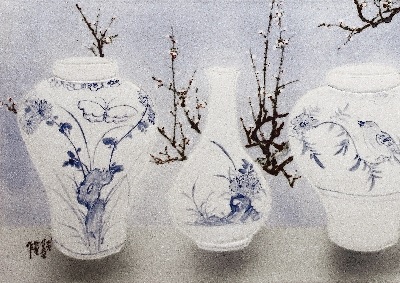 이번 전시회에 공개되는 작품 「반추反芻」는 국보급 도자기를 평면적인 도판에 그림으로 그려 이색적인 느낌으로 다가온다. 171×64cm의 크기로 흰색바탕의 푸른빛 그림이 신비스런 장면을 연출한다. 조선화가들과 도공들의 합작품인 철화도자기는 순수하고 단순해 보이지만 고도의 기술을 필요로 하는 작품이다. 이들에 대한 존경심을 바탕으로 평면 백자도판에 조선 예술가들의 작품을 옮겨 놓았다.