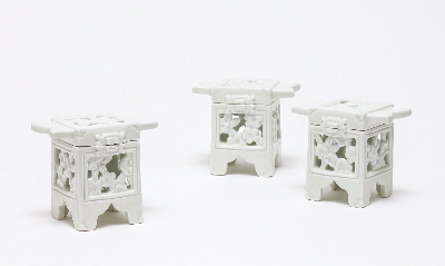 전통가구를 견고하게 만드는 금속제 장식인경첩과 단순화된 자물쇠모양은 백자함을 구성하는 양각기법의 장식기능과 동시에 작품의 앞뒤구분, 함이라는 기능의 역할을 가능케 한다. 사각형의 비례아래 한국 전통공예 대표적인 여러 장식요소로 전통금속제나 목가구의 화려함을 백자가 지닌 포용력의 자세로 융합한 작품에서 혼성의 미가 엿보인다.