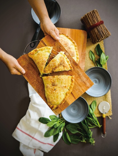 반으로 접은 피자 모양을 한 시금치 치즈 칼조네는 반죽에 리코타치즈, 모짜렐라 치즈, 시금치 등을 넣어 오븐에 구운 반달 모양의 만두와 같다.