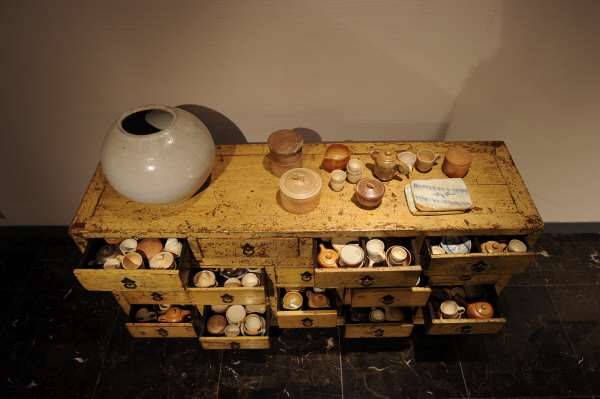 그는 이전에 해왔던 ‘기물’의 집적시리즈 연장으로서 ‘가구에 놓이고 쌓여지는 집적’이라는 주제로 전시를 준비했다. 이번 전시에는 대략 750여점의 크고 작은 기물들이 모여 있으며, 특히 이랜드가 소장하고 있는 중국 고가구와 함께 전시돼 흥미롭다. 탁자, 책장, 찬 장 등 다양한 형태의 손때 묻고 마모된 중국가구들은 각기 다른 재질과 색상으로 구성된 하나의 공간이다. 가구의 용도가 만들어내는 공간에 다양한 형태의 기물 이 쌓이고 포개진다. 이인진 작가는 이번 전시에 대해 “가구와 기물이 만나 새로운 공간을 만들어내고, 그것이 또다시 조형적 형 태를 만들며 기물을 입체적 형태로 해석해보고 싶었던 실험”이라고 말했다. 나아가 그는 과거 우리의 부엌과 마루 등 동양의 주거공간에서 보여주던 기물의 아름다움, 그리고 그릇의 재구성과 재배치를 통한 조각적 미美와 시간時間의 흔적까지 보여주고자 했다.