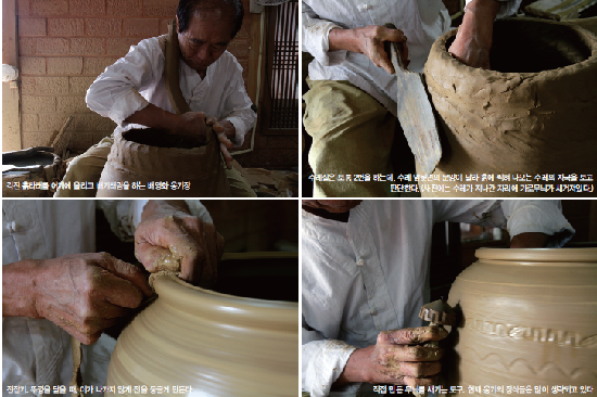 옹기장은 차분하게 물레 앞에 앉아 6각형의 흙타래를 어깨에 척-하니 올리고 쌓아 나간다. 그 후 도개와 수레를 이용해 쌓은 흙을 쳐댄다. 경상도지역 특유의 ‘배기태림’기법2)이다. 이게 수레질이다.(배영화 옹기장은 수래가 꼭 부채처럼 생겼다고 해서 “부채질”이라고도 한다). 옹기장들은 자신의 손에 맞게 직접 나무를 깎아 도구를 제작하는데 이번엔 나무버전의 반달무늬돌칼 같은 도구가 나타난다. 이건 근개다. 근개로 수레질이 끝난 표면을 정리한다. 몇 마디 나누는 새 그가 전을 정리한다. 이 과정을 전잡기라 부른다. 40리터짜리 커다란 쌀독을 손수 만드는 데 고작 삼십여분이 걸렸다. 이번 시연에서 당연히 배가 부른 경상도 옹기를 제작할 거라고 생각했는데 완성된 결과물은 일자형의 쌀독이었다. 현대인의 주거문화가 마당에서 베란다문화로 변하면서 배 불룩한 형태보다는 공간을 효율적으로 쓸 수 있는 날렵한 일자형 옹기를 제작한다고 한다.(최근에는 귀농인구도 늘어나 전통적인 옹기형태를 찾는 이들도 많다고 한다) 또 다산을 상징하던 게 문양의 그림도 현대에 들어 많이 생략됐다. 언제까지나 전통의 범주에 머무를 것만 같던 옹기도 천천히 21세기의 옷을 입고 있었다.