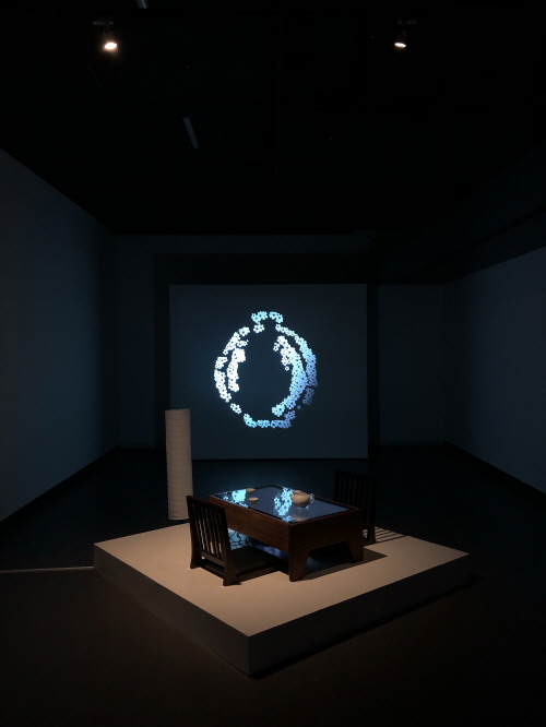 김 4부에 선보인 「Media 茶談 2다담」 작품입니다. 터치스크 린과 근거리 무선통신 WPAN: wireless personal area network , 온도 감지 센서가 적용된 차 미디어 테이블이에요. 우리나라 차 는 중국차랑 달리 끊는 물을 바로 붓지 않고 식혀서 붓는 것 에 힌트를 얻었어요. 테이블은 70℃의 온도에서 반응합니 다. 다기에 물을 넣으면 테이블이 반응해서 1분 30초 후 꽃 이 만발해요. 다기 뚜껑이랑 미디어 테이블이 통신을 합니 다. 냇가에 꽃을 띄우듯 차를 마시고, 더불어 이야기를 나 눕니다. 그래서 작품은 ‘다담 만리 茶談 萬里’, 차와 더불어 나누 는 이야기가 끝도 없이 이어진다는 선조들의 풍습을 염두 하고 제작했어요. 차 미디어 테이블을 중심으로 정면에 펼 쳐지는 광경은 금강산이 그려지고 있는데요. 정선의 금강 산을 캡쳐하여 영상으로 제작했습니다. 흑백 배경으로 흰 색 라인에 꽃이 맺히게끔 프로그래밍 하였습니다. 이 영상은 경기도자비엔날레가 끝난 후 2016년 한국도자재단과 국립민속박물관이 공동 기획한 <쉼, 흙길 걷다>전에 출 품한 작품이에요. 이 영상의 특징은 사람들이 움직이면 꽃 이 따라다녀요. 사람들이 생각하는 금강산은 천국인 것처 럼 ‘여민락’의 정신을 담은 작품입니다.