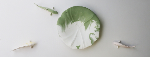 고요한 연못 위로 연잎이 떠있고, 비단잉어가 모여드는 몸짓에 이랑이 일어난다. 출렁이는 물결은 연잎의 문양 으로 투영되고, 무성한 연잎 사이로 비단잉어가 노니는 듯한 실경 實景이 가장 먼저 눈길을 끈다. 이번 전시에서 선보인 김광길 작가의 <연잎이야기>시리즈는 자연의 소재에서 마주하고 느끼는 우리의 정서를 연못의 풍경 으로 투영한다. 연꽃잎과 잉어의 이끌림을 나타낸 「인 연因緣」, 잉어가 구름떼처럼 몰려드는 모습의 「이운 鯉雲」, 초여름 잎이 우거진때 내리는 「녹우綠雨」, 비 온 뒤 맑게 갠 하늘을 표현한 「청천晴天」 등 소나기, 천둥소리, 초록 향기 등 여름에 일어날 수 있는 자연의 형상을 작품 제 목에 풍부하게 반영했다. 설치된 작품을 둘러보다 보면 한 폭의 풍경같은 작품은 포장없이 솔직한 타이틀로 더 넓고 새로운 영역으로 확장시켜준다.
