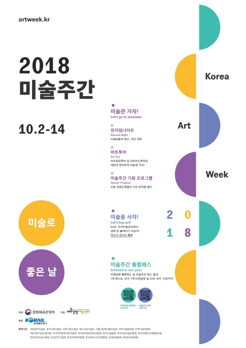 <2018 미술주간>이 ‘미술은 삶과 함께Art in Life’라는 주제로 10월 2일부터 14일까지 13일간열린다. 올해로 4회째를 맞이한 이번 행사는 ‘미술로 좋은 날’이라는 표어 아래, ‘미술관 가자’, ‘미술품 사자’ 등 다양한 캠페인을 진행한다. ‘미술관 가자’ 캠페인에서는 서울, 공주, 부산, 창원, 대구, 광주, 목포에서 열리고 있는 비엔날레들과 한국국제아트페어KIAF2018 ART SEOUL를 연결하는 미술주간 통합패스 2종을 발권해 한 장의 티켓으로 간편하게 비엔날레와 페어를 관람할 수 있도록 했다. ‘미술주간패스’는 한국국제아트페어KIAF와 광주비엔날레(19,000원) 또는 부산비엔날레(18,000원)를 연계한 입장권으로, 10월 2일부터 14일까지(13일) 미술주간 기간 동안 이용할 수 있다. 또한 ‘비엔날레통합패스’, ‘미술주간패스’ 구매자에 한해 철도이용권 ‘미로랑’ 3일권(92,700원), 5일권(123,600원)을 전국 주요 코레일 여행센터에서 구입할 수 있어 부담없이 찾아가 즐길 수 있도록 했다. 특히 다양한 비엔날레를 보다 편리하고 저렴하게 관람할 수 있는 ‘미술주간 통합이용권(패스)’을 새롭게 출시했다. ‘비엔날레 통합패스(16,100원)’는 광주비엔날레, 부산비엔날레, 대구사진비엔날레, 전남국제수묵비엔날레를 연계한 통합이용권으로, 9월 1일부터 11월 30일까지 3개월간 통합입장권 하나로 전국 주요 비엔날레에 입장할 수 있다. 더욱이 ‘미술품 사자’ 캠페인은 작가미술장터에서 미술품을 구입하면 2~3개월 무이자 할부 혜택을 제공할 예정이다. 문화체육관광부와 예술경영지원센터가 공동으로 마련한 이번 행사는 ‘2018 한국국제아트페어K10.4~10.7’와 연계해 ‘화랑주간코리아갤러리위켄드’ 행사도 개최된다.