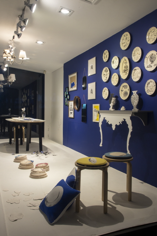 각기 다른 7점의 작품들을 하나의 연결된 작품으로 구성했다. 그중 테이블에 설치된 ‘블루 바니타스Blue Vanitas’는 인생의 헛됨을 상징이 있는 정물과 꽃으로 표현한 17·18세기 네덜란드 바니타스 페인팅Vanitas Painting에 영감을 받아 현대적으로 재해석한 작품이다. 13개의 본차이나 접시를 캔버스로 사용, 동서양 역사 속 다양한 삶의 기록을 남긴 파란색이 일상의 다이닝 테이블을 통해 현대의 시대상을 들려준다. ‘퀸즈웨어에 아로새긴 금 사과Apples of Gold in Settings of Queensware’는 1774년 영국 웨지우드Wedgwood 공장에서 처음 생산된 퀸즈웨어Queen´s Ware 형태에, 당시 사용되었던 패턴북Pattern Book에서 응용한 드로잉으로 테이블 세팅을 표현한 작업이다. 3D 형태가 2D로 또 그 반대로, 차원과 공간이 다르게 변화되며 다양한 빛의 인상을 보여준다.