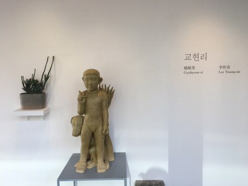 전시장에 들어서자 손가락으로 V자를 그린 개구진 소년이 가장 먼저 맞이해 준다. 오른쪽으로 코너를 돌아가니 장화와 낫, 감자 한 무더기, 삽과 갈퀴를 든 야무진 소녀 등 농촌의 한 장면을 연상시키는 작품이 전시돼 있다. 전시 제목인 ‘교현리’의 풍경일까? 과연 교현리는 어떤 곳일까? 전시장 벽에 적힌 글에 따르면, ‘경기도 북동쪽 북한산 밑자락. 녹색이 자라고 수확의 시간이 보이는 햇볕이 따뜻한 이곳’이 교현리다. 이영미 작가가 살면서 작업하는 동네, 전시를 보고나면 교현리에 한번 가보고 싶어진다.