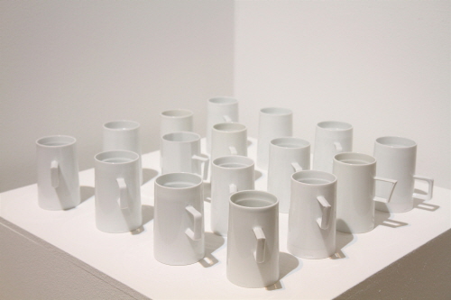 이해정의 백자는 깔끔하게 떨어지고 각진 형태를 취하고 있으나 들여다 보면 볼수록 즐거운 요소들이 드러난다. 컵의 경우 바닥에 음각 혹은 양각의 모스부호들이 새겨져 있다. 기물이 놓이는 플레이트에는 선을 음각해 기물과 플레이트 사이의 관계성을 표현해냈다. 작가는 전하려는 메시지를 슬립캐스팅기법과 CNCComputerized.Numerical.Control기계를 이용해 간결한 형태로 새겨 넣는다. 폭이 좁고 면이 쳐져 있거나 혹은 직선적으로 표현된 작업들은 한데 모여 건축적인 힘까지 발휘한다. 조휴진의 작업은 3D프로그램을 이용하여 미리 결과물을 확인하고, 슬립캐스팅 기법을 이용해 형태를 제작한다. 기물표면에 선을 긋거나 혹은 동그란 무늬로 면을 깎아내며 본인만의 정체성을 드러낸다. 두가지 색을 이용한 도트무늬 작업은 겉 표면에 해당하는 슬립을 먼저 제작한다. 석고틀에 붓고 기벽이 형성된 후 내부를 비워낸 뒤 내부표면으로 사용할 색슬립을 차례로 캐스팅하는 방법으로 두 개의 색소지가 만드는 기물을 구현해낸다. 작업들은 세트를 이루기 보다 작업 하나하나의 간격을 두고 개별적으로 보여줌으로써 형태를 보여주는 것에 집중했다. 볼 혹은 컵, 화병 하나하나가 그 자체로 사랑스러운 느낌이 상당해 보는 이들의 애착을 불러일으킨다. 컵 위에 티팟을 올릴 수 있는 적층식 구조는 실용성을 염두한 작업인 동시에 감상하는 것만으로 놓여진 공간의 분위기를 전환하는 역할을 한다.