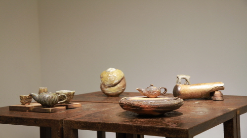 김대웅 도예가의 개인전 <숨,,, 차의 주변에서>가 지난 4월 6일부터 19일까지 14일간 갤러리 민에서 열렸다. 이번 전시는 옹기판장변형기법을 활용해 흙 본연의 아름다움을 살린 조형작품과 다도구들이 마련됐다. 작가가 이름 지은 옹기판장변형기법이란, 옹기토를 바닥에 던지고 치대는 과정에서 형성된 다양한 형태의 도판을 말아 기의 형태로 변형하는 것을 말한다. 작가는 도판제작 과정에서 생긴 텍스쳐를 그대로 살린 표면장식을 선보였다. 또한 무유번조의 요변효과를 통해 얻은 특유의 색감과 질감은 자연스러운 아름다움으로 드러났다. 이러한 과정에서 확인할 수 있듯이 작가는 흙을 던지고, 가마를 떼는 등 작업과정의 모든 행위를 작업화하여 작품에 의미를 담는다.