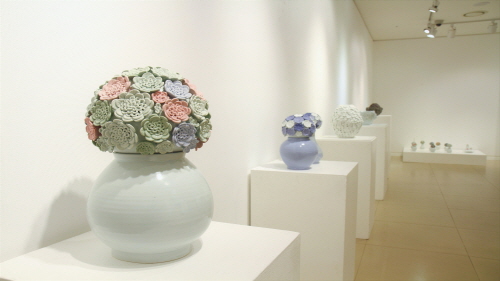 김태영 도예가의 여덟 번째 개인전 이 지난 3월 27일부터 4월 2일까지 7일간 갤러리1898에서 열렸다. 이번 전시는 ‘Flower Bloom’를 주제로 순결한 사랑을 의미하는 꽃을 장식요소로 활용한 도자조형 합을 선보였다. 작가는 손수 빚은 백자 꽃을 빼곡하게 붙인 합 형태의 조형적 특징을 바탕으로 작품명을 붙였다. 작품「부부」는 뾰족한 꽃잎을 통해 날카로운 마음을 서로 보듬어 주는 부부의 모습을,「신부」는 드레스를 입은 여인의 모습을 닮아있다.