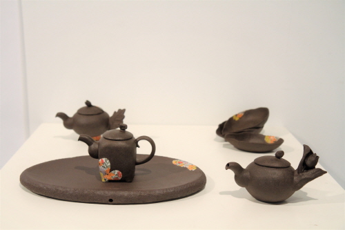 전시장 중앙에 걸린 작가노트의 문장처럼 애달프면서도 생기를 품은 꽃잎이 작품마다 섬세하게 채색되어 있었다. 그중 인상 깊은 작업은 다관 손잡이의 형태를 꽃의 다발이나 잎사귀의 모양으로 표현한 작품이다. 다관 뚜껑의 꼭지가 꽃봉오리 형태인 작품도 있는데 기존의 찻그릇 형태에서는 보기 힘든 자유롭고 입체적인 장식성을 보여준다. 이번 전시에서 관람객의 관심을 많이 받은 작품이 ´토우 잔´이다. 찻잔 위에 토우 인형이 걸터 앉거나 기대어 있어 이야기를 만들어낸다. 강인순 작가는 99년부터 토우 전시에 참여해 민속 토우 작가로서 활동을 시작했다. 본격적으로 찻그릇 작업을 하게 된 것은 2005년부터이다. 창의성은 경계에서 생겨난다는 말처럼 그의 토우 작가 경력은 찻그릇 작업에 강한 개성을 불어넣었다.