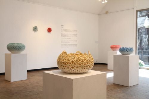 마치 항아리를 닮은 듯 아름다운 꽃봉오리 형태, 꽃이 피기까지의 그 과정, 보색대비가 돋보이는 작품 간 배치 등 이승원 작가의 개인전에서 볼 수 있었던 전체적인 모습이다. 각각의 기물들은 작은 유닛(Unit)들을 통해 서로 엮이고 엮어 있다. 그 위에 새겨진 덩굴 형태의 텍스처는 이런 유닛 간 연결성을 더욱 부각시킨다. 파스텔 톤의 차분한 색감은 보색대비의 영향 때문일까. 작품들이 더욱 뚜렷하게 보이는 효과를 나타낸다.