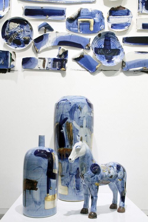 순도 높은 백자에 청색의 코발트 안료로 그림을 그려 구워낸 청화백자. 우리나라에서는 15세기 경 명나라에서 전해져 만들기 시작했는데 코발트가 조선에서는 생산되지 않았고 가격도 무척 비쌌기 때문에 왕실이나 관청용으로만 제작되었다. 그 만큼 백자 자체와 그 위에 그려진 그림의 수준은 당대 최고라 할 수 있다. 전시장에서는 조선시대와는 비교할 수 없을 정도로 자유롭게 청화백자를 제작하는 현대 도예가들의 작품을 감상할 수 있다. 백자에 꽃이나 나무 등의 그림을 그려 넣거나 잔잔한 패턴을 넣은 작품부터 파란색을 면으로 칠해 모던한 느낌을 준 작품까지 다양하다. 여러 작품들 중에서 단연 눈길을 끄는 것은 한 벽 가득 청화백자 접시들을 붙여 한 마리의 말을 표현한 김순식 작가의 설치 작품이다. 원과 사각을 기본으로 하는 자유로운 형태와 붓으로 단번에 칠한 듯한 청색의 농담, 여기에 포인트로 더해진 금색이 어우러져 생동감 넘치는 말이 되었다. 도자 그릇을 그림으로, 다시 설치 작품으로 승화한 멋진 작품이다.