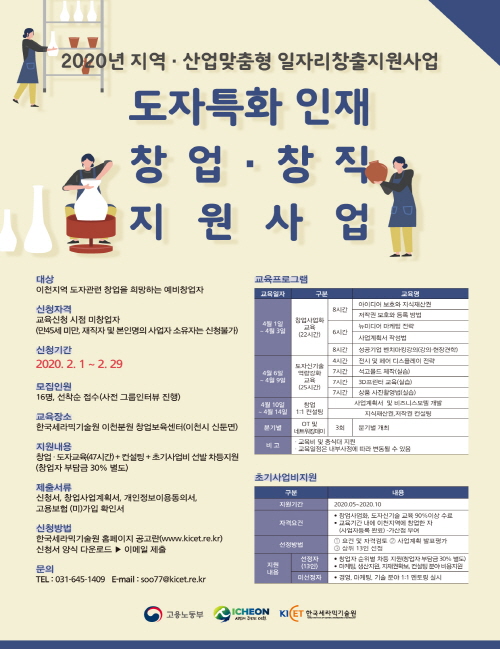 한국세라믹기술원은 지역과 산업에 맞는 일자리 창출을 위한 <도자특화 인재 창업·창직 지원 사업>에 신청자를 모집한다. 모집대상은 이천지역의 도자관련 창업예정자로, 신청 기준 미창업자, 만45세 미만 지원자에 해당한다. 접수인원은 선착순 16명으로 그룹인터뷰를 통해 선발한다. 신청방법은 한국세라믹기술원 홈페이지www.kicet.re.kr에서 신청서 양식을 다운받아 작성하고, 창업사업계획서, 개인정보이용동의서, 고용보험(미)가입 확인서 등 준비서류와 함께 기술원 이메일soo77@kicet.re.kr로 제출하면 된다. 지원자에게는 창업 및 도자교육(47시간)과 전문컨설팅 제공, 초기사업비 지원금(창업자 부담금 30%별도)이 제공된다. 도예관련 창업교육은 ‘창업사업화교육(22시간)’과 ‘도자신기술 역량강화교육(25시간)’, ‘창업 1:1컨설팅’으로 나눠 진행된다. ‘창업사업화교육’은 아이디어 보호와 지식재산권, 저작권 보호와 등록 방법, 뉴미디어 마케팅 전략, 사업계획서 작성법, 성공기업 벤치마킹 강의 등을 다루며, ‘도자신기술 역량강화 교육’은 전시 및 페어 디스플레이 전략, 석고몰드 제작, 3D프린터 교육, 상품사진촬영법 등의 과정으로 진행된다. ‘창업 1:1컨설팅’은 사업계획서·비즈니스 모델 개발, 지식재산권·저작권 컨설팅으로 진행될 예정이다. 초기사업비지원은 제공교육을 90%이상 수료한 자로, 교육기간 내 이천지역에서 사업자등록을 마친 자에게는 가산점이 부여된다. 사업비지원신청은 창업자를 대상으로 상위 13인을 선정해 차등지급하며, 오는 5월부터 10월까지 5개월간 진행된다.