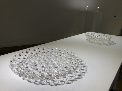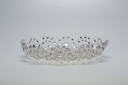 양식화의 과정을 거친 개체는 접합을 통해 작품의 형태를 이룬다. 하나의 작품은 한 가지 도안으로 구성하되 개체 크기에 변화를 주고, 적절한 배치로 질서를 부여한다. 작가는 금속판과 금속선을 연결하여 개체를 따로 만들거나 용해된 금속을 형틀 속에 넣고 응고시키는 주물Casting로 개체를 반복 생산한 뒤, 땜질Soldering 혹은 용접 Welding으로 접합한다. 고온의 불을 순간적으로 다루는 땜질과 용접은 세심한 집중력을 요하는 금속 접합 기법으로, 여러 개체를 견고하게 연결하는 데 효과적이다. 작품 은 최소한의 접합면으로 반복적이고 집합적인 구조를 형성하고, 섬세한 개체가 군집적으로 만들어낸 외곽선은 간결한 율동감을 보인다.